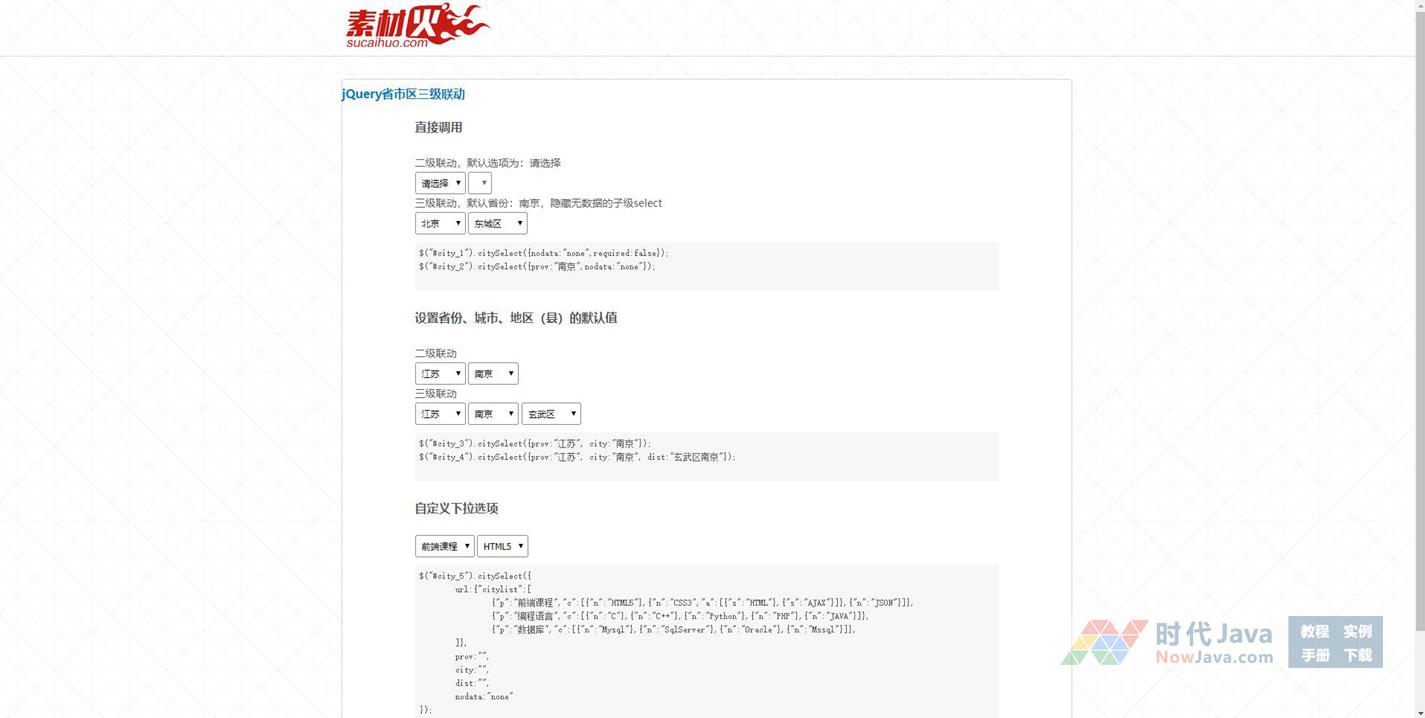 本DEMO演示了三种不同的联动方法,直接调用二级联动省市、设置省份、城市、地区(县)的默认值以及通过定义数组自定义下拉选项。默认jQuery联动调用方法:$("#city").citySelect();