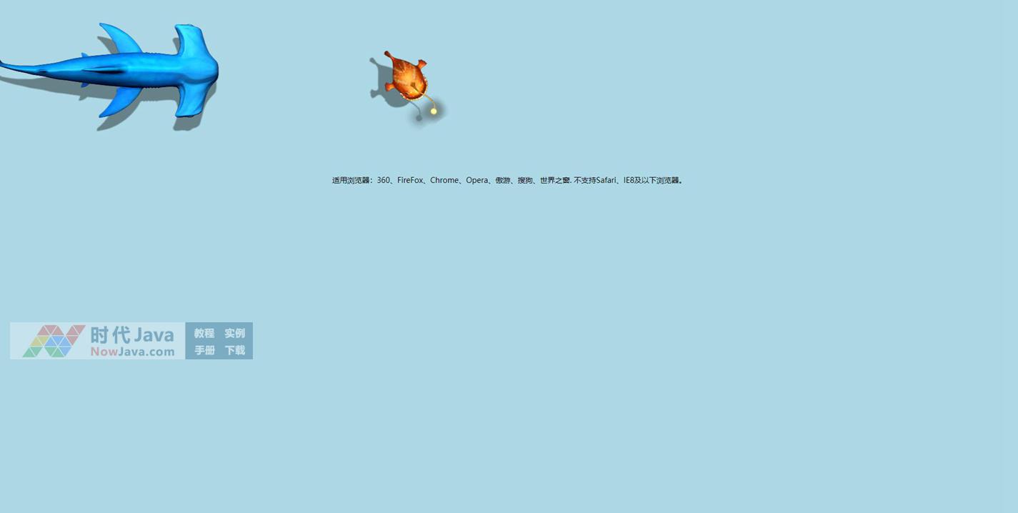 这是一款基于css3 animation transform属性制作的鱼游动动画特效,用background-position属性实现两条游动追逐的鱼。