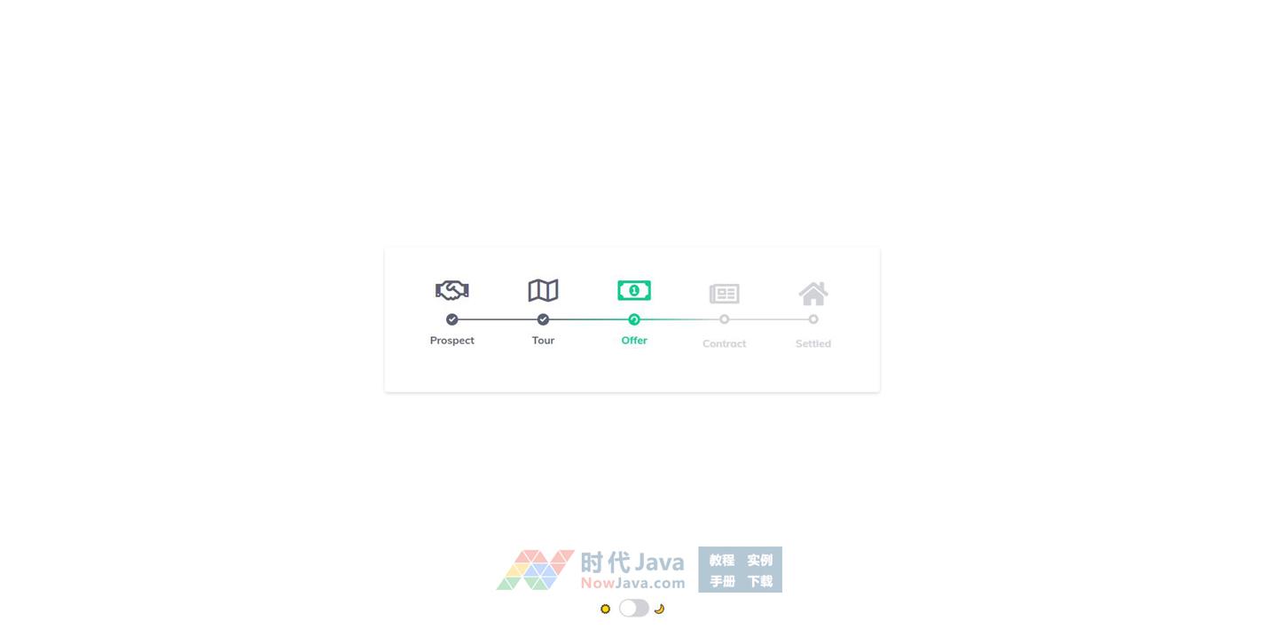 一款好看的CSS3 SVG房屋交易步骤流程图样式特效,合作、签署、付款、填写、交付房屋购买五步骤布局样式代码。支持类似开关灯效果的黑白背景切换。