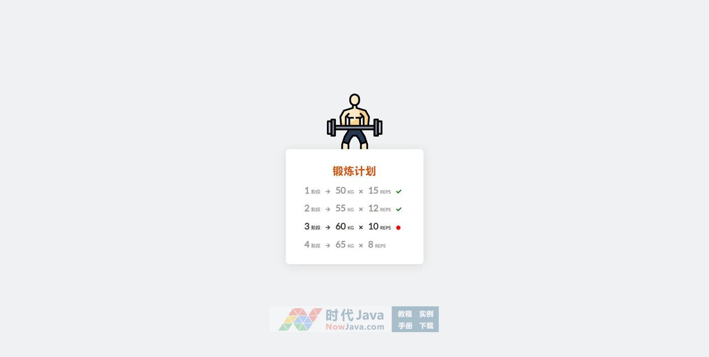 css3制作的一款健身锻炼计划表格ui布局样式代码,分为已完成、进行中和未完成三种阶段标识。