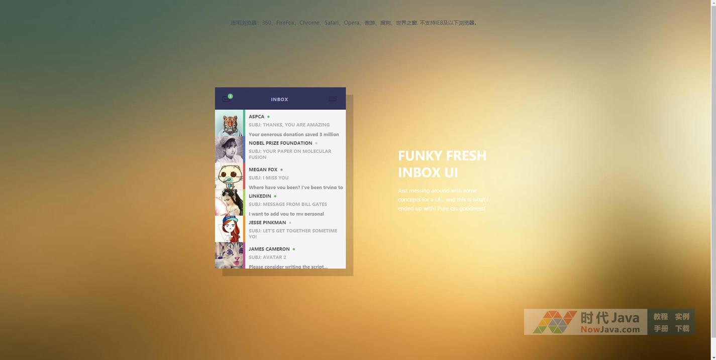 一款以简洁的列表方式列出所有的邮件,当用户点击相应的邮件时会以动画的方式弹出该邮件的详细信息的CSS3点击收件箱列表查看邮件特效。