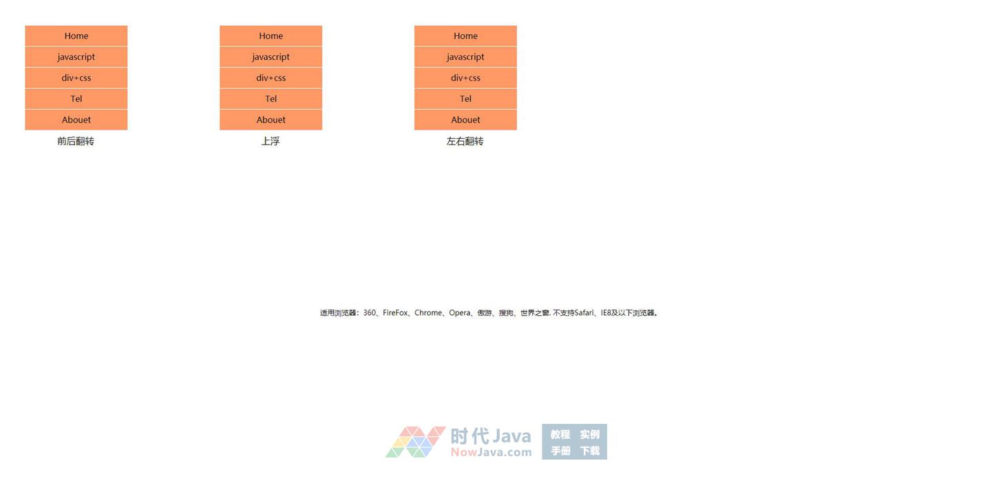 CSS3制作的一款简单鼠标经过导航菜单动画效果代码,三种菜单栏效果分别是:前后旋转,上浮,左右旋转。