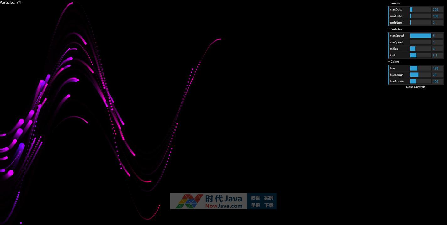 HTML5 Canvas彩色大波浪粒子动画特效,正弦波浪流动动画特效,右侧可以自定义设置各种参数。