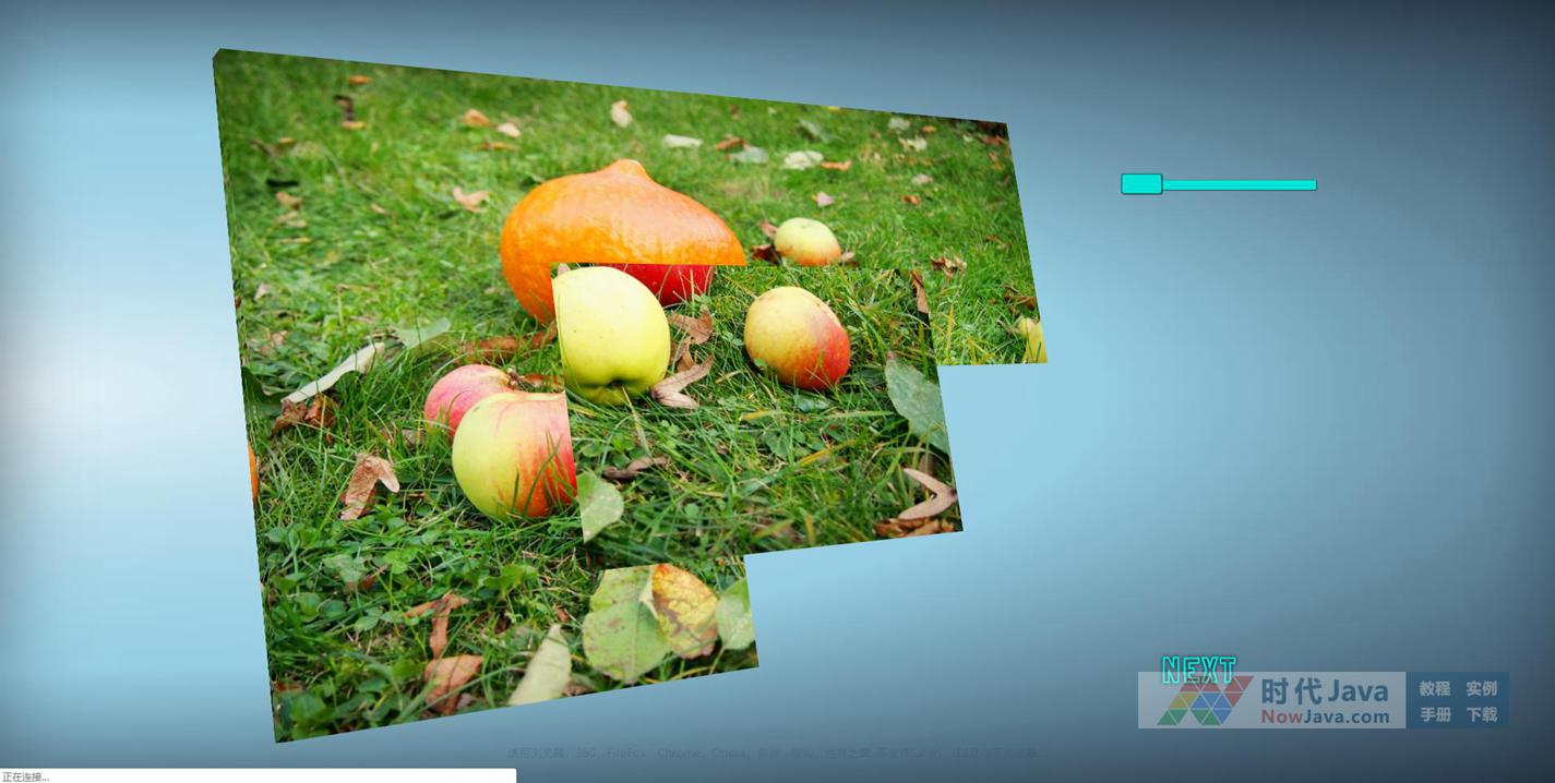 很有创意的一款HTML5图片倾斜3D旋转轮播代码,全屏图片倾斜布局,支持滑块拖动从不同角度看图片3D翻转效果。