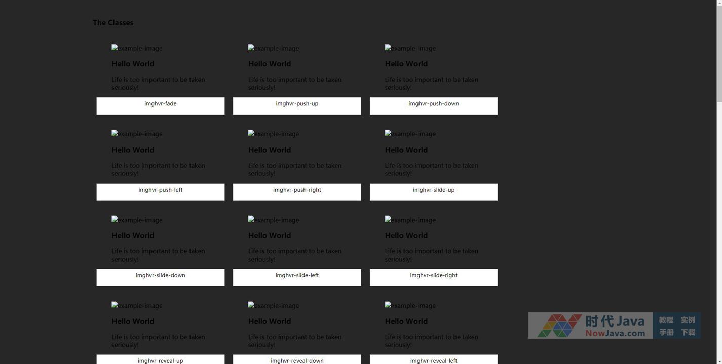 效果描述: imagehover.css CSS库 里面包含了好多纯CSS3鼠标悬停后的图片效果 可以直接拿来使用 使用方法: 1、将CSS中的样式拷贝到你的网页中 2、将body中的代码部分拷贝到你需要的地方即可