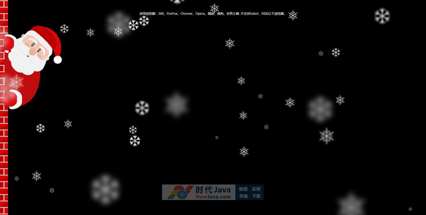 一款非常有创意的jQuery+CSS3左侧边栏圣诞老人滑动面板特效,全屏背景雪花下雪场景动画,圣诞老人也有说话打招呼动画效果。