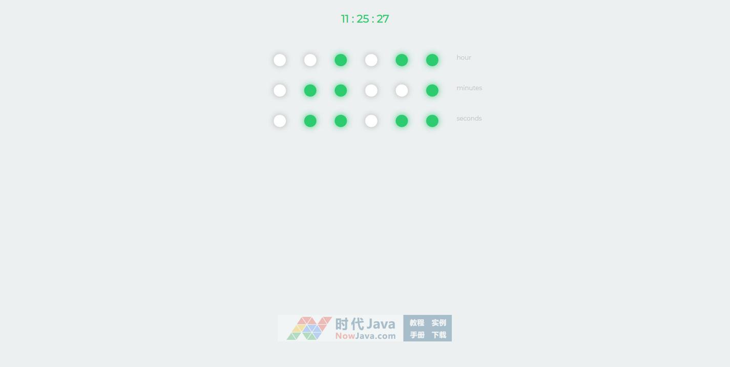 一款很烧脑的jQuery二进制数字时钟代码,时分秒都是用二进制来表示,绿色表示该位值是1,灰色则表示0。其实实现原理也是很简单,无非是将时钟的时分秒分别实时转换成二进制,然后随着本地时间的更新而实时刷新。一般人看不懂吧?
