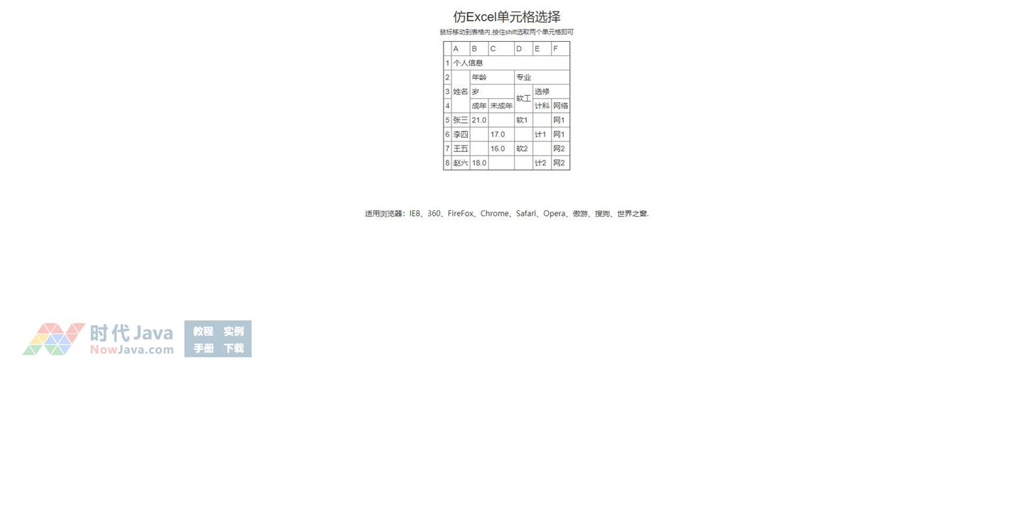 jQuery仿Excel表格选中单元格变色特效,仿Excel单元格选择代码,鼠标移动到表格内,按住shift键可选取多个单元格。