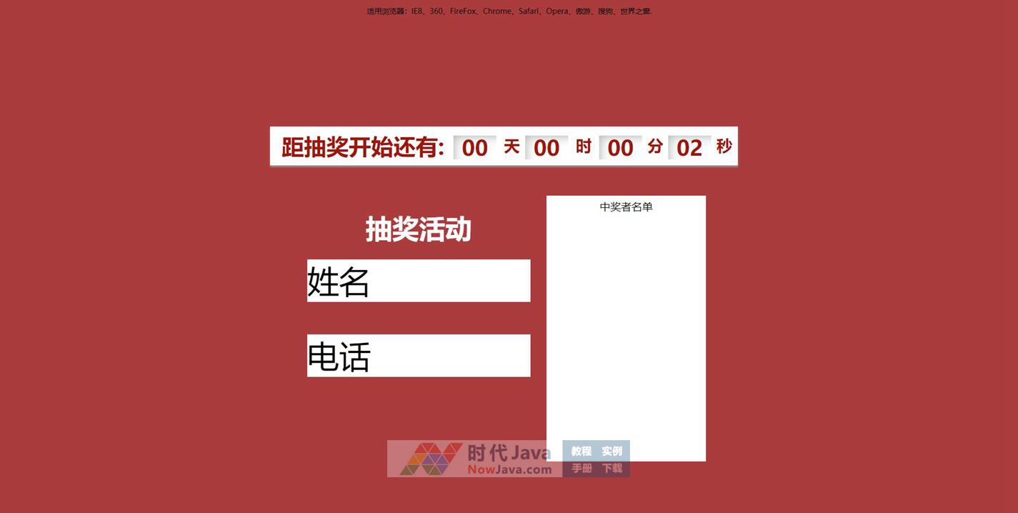 这是一款很简单的jQuery倒计时自动随机抽奖代码,倒计时结束后自动抽取中奖者的姓名和手机号码。js注释非常详细,新手也能用。