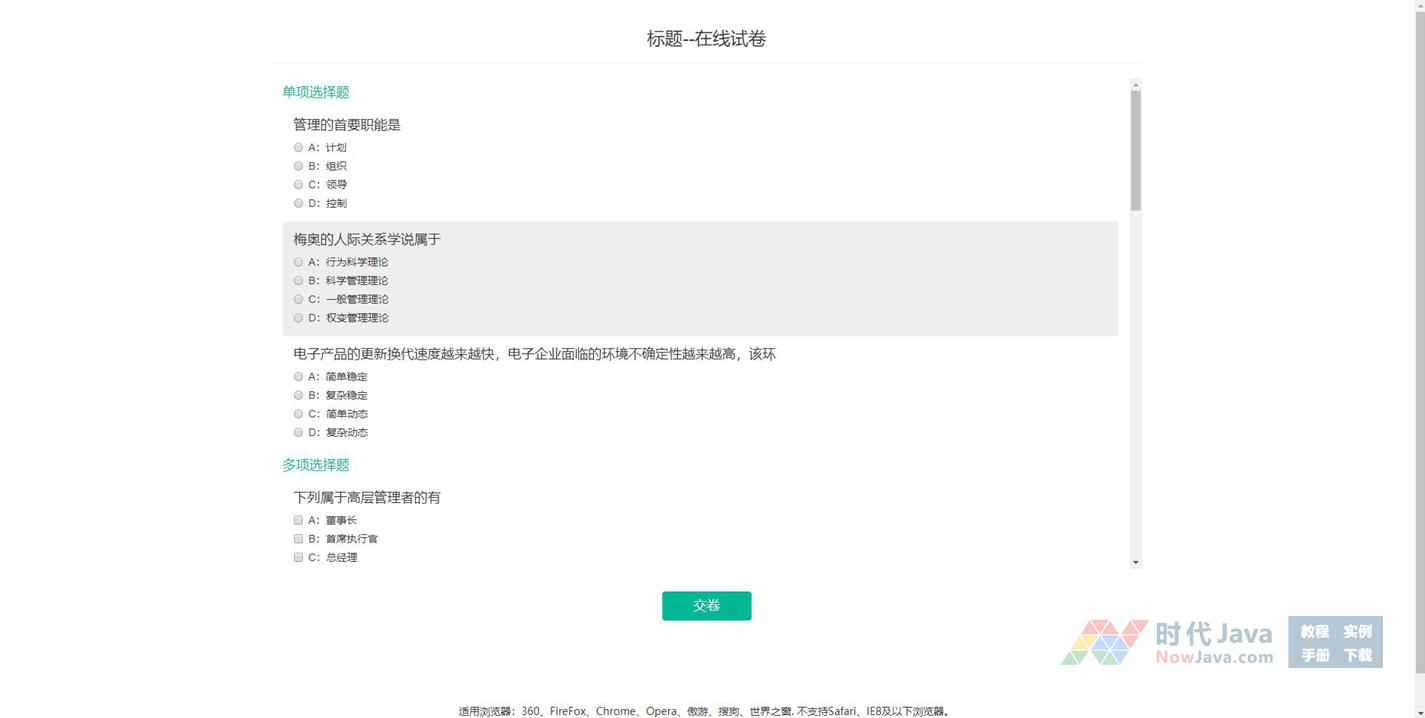 jQuery在线考试答题代码是一款在线填写试卷并提交判断答案对错的在线问答代码,有单项选择题、多项选择题、判断题,填空题、解答题、论述题、完形填空、阅读理解等答题选项。