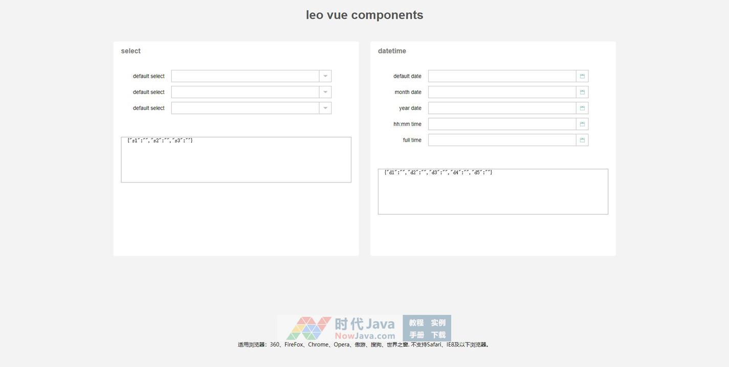 jQuery基于vue.js下拉框菜单选择和日期时间选择代码,日期时间选择有多种效果,并获取值显示在下方文本框内。