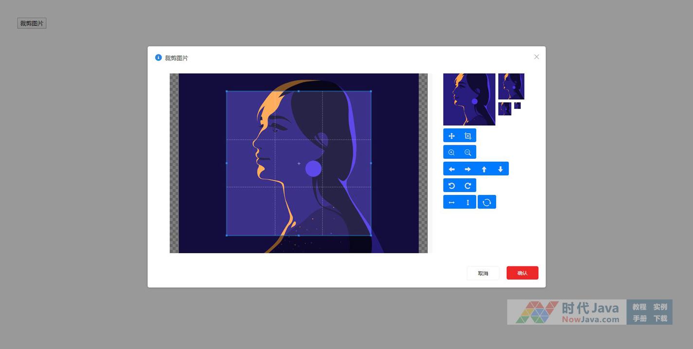 jQuery头像图片裁剪尺寸插件,点击“裁剪图片”按钮弹出裁剪功能窗口,支持移动图像、裁剪图片、放大缩小、上下左右移动、翻转、重置等功能。