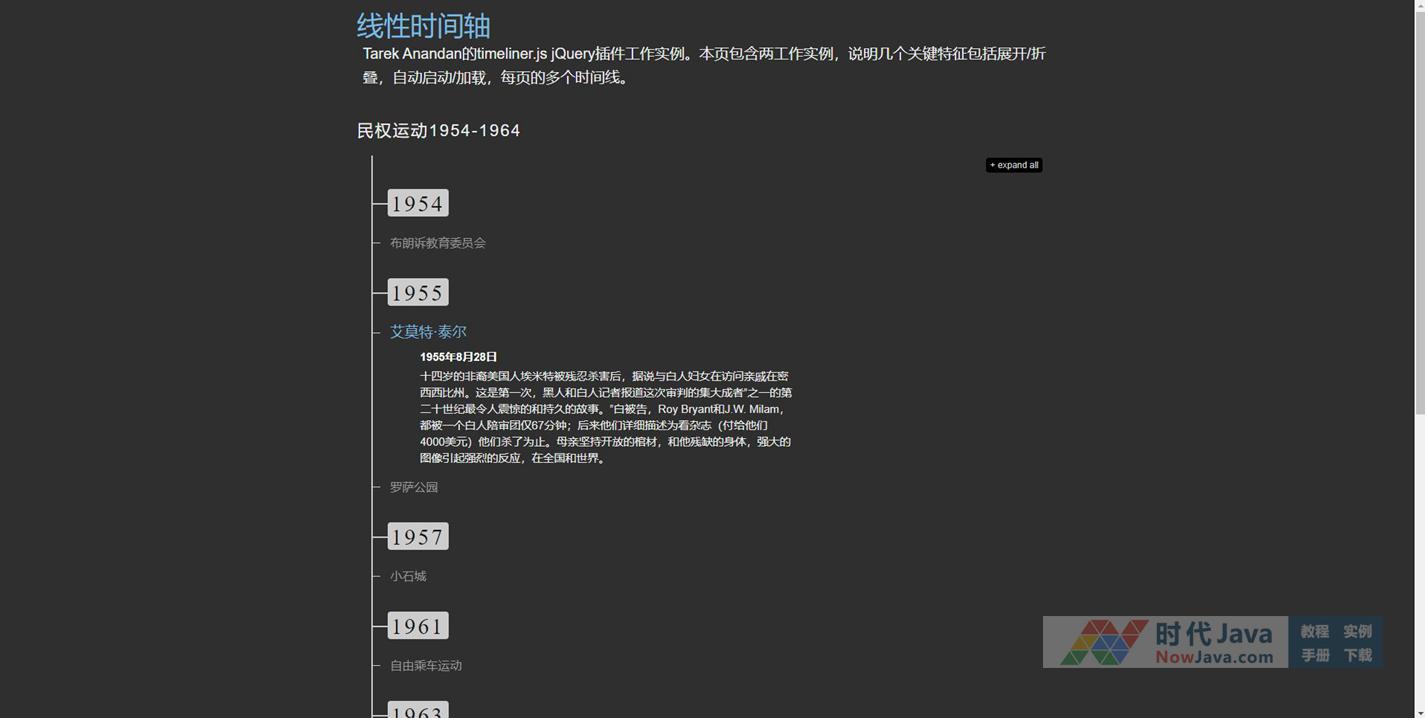 Tarek Anandan的timeliner.js jQuery插件工作实例竖直线性网页时间轴特效。本页包含两工作实例,说明几个关键特征包括展开/折叠,自动启动/加载,每页的多个时间线。