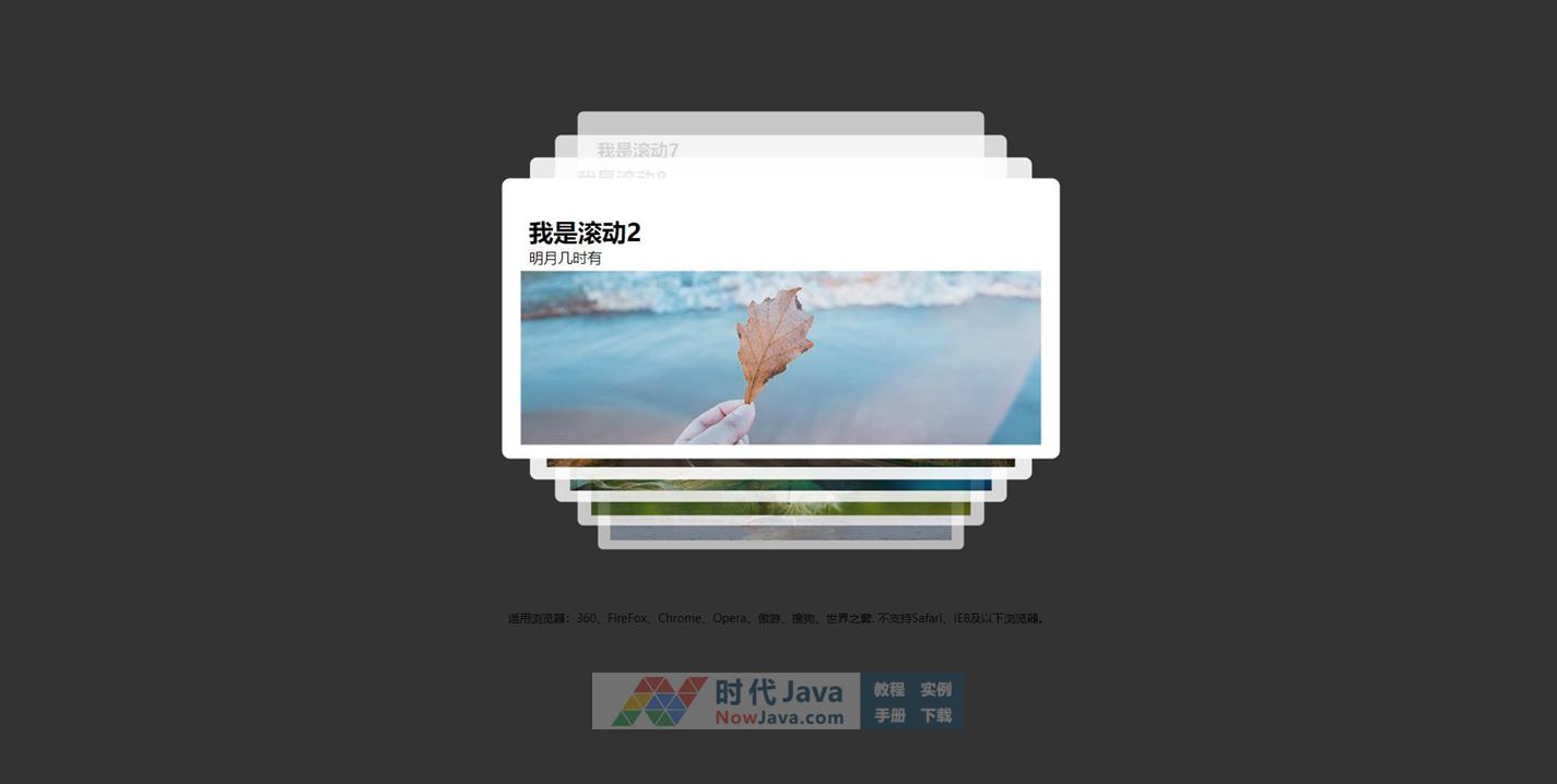 jQuery带标题图片层叠上下翻滚轮播切换特效,一款很有层次感的图文卡片叠加滚动切换效果,默认有主标题与副标题文字显示,你不需要的话可以去掉。