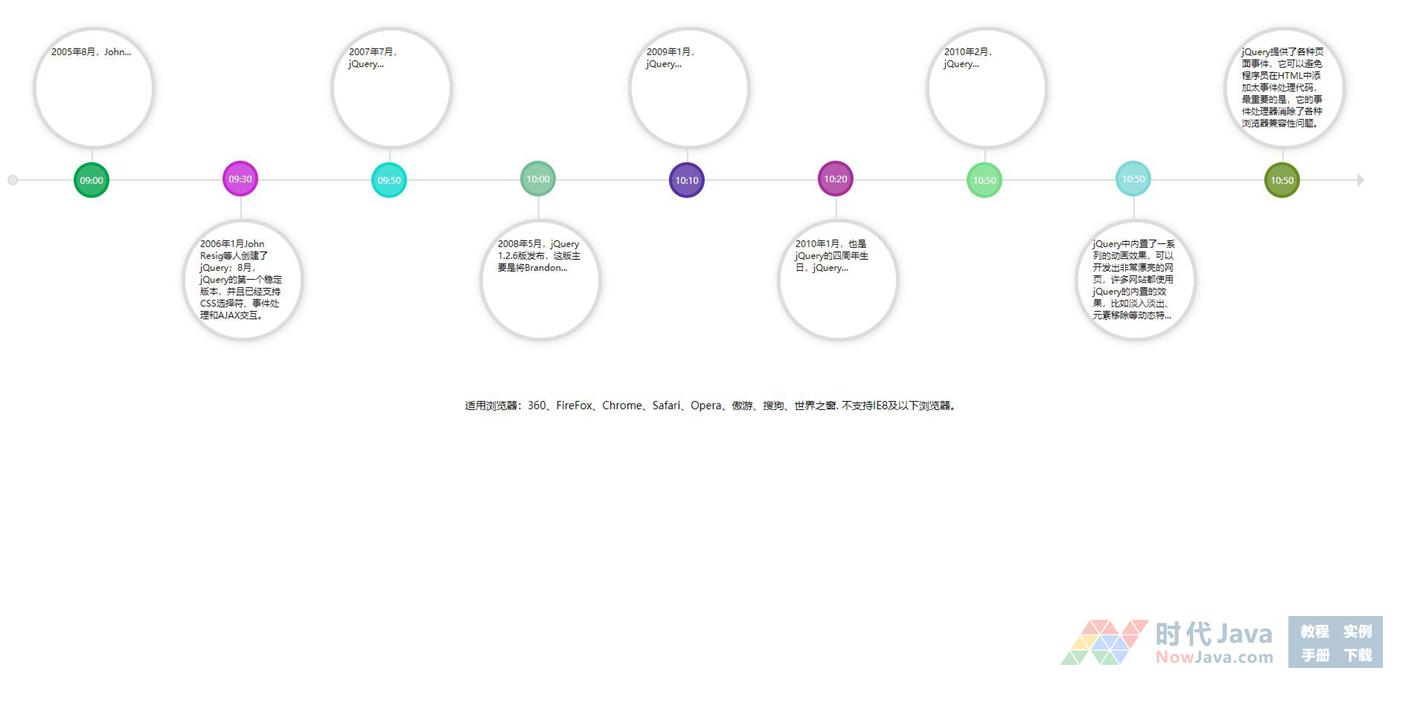jQuery水平布局软件版本更新信息时间轴代码是一款以圆形风格样式水平线性布局的网页时间轴代码,还可以用于记录企业大事记等信息。