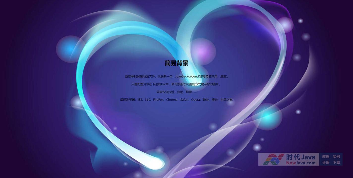 超简单的背景动画文件,代码就一句,JoynBackground(您需要的效果,速度);只需把图片放在下边的Div中,就可按照您向要的方式展示您的图片。效果包含拉近,拉远,切换……