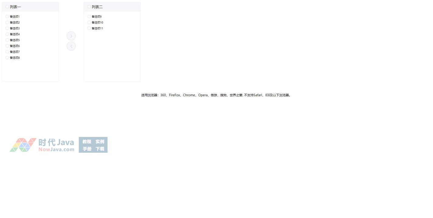 jQuery穿梭框左右列表添加删除代码,支持多选和全选,选中列表选项后点击左右箭头按钮控制列表选项左右转移。