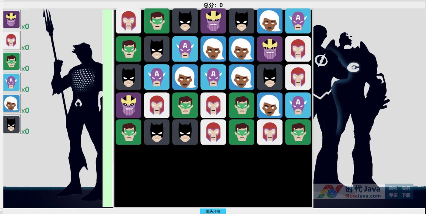 jQuery网页消除方块小游戏源码是一款通过排列3个或3个以上紧邻的英雄方块来消除方块。