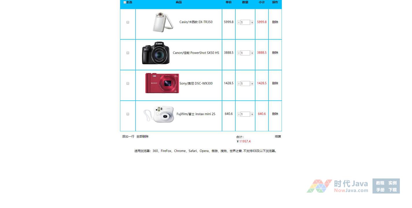 jQuery购物车商品数量加减合计代码是一款购物网站常用的购物车数量加减,勾选删除,添加行数,总计等。