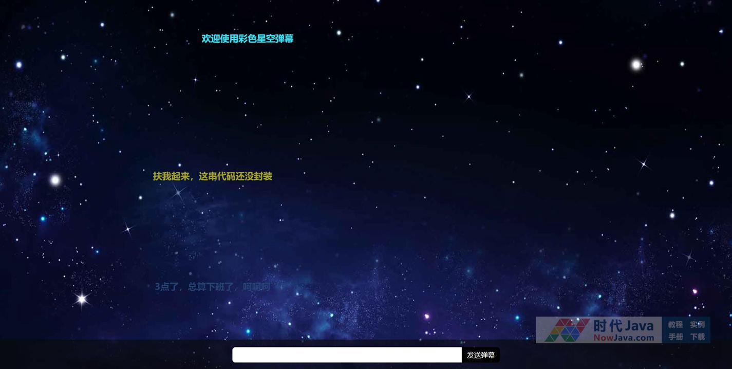 js全屏星空背景发送文字弹幕动画特效,动画效果基于animation.css动画库,弹幕文字颜色随机显示。