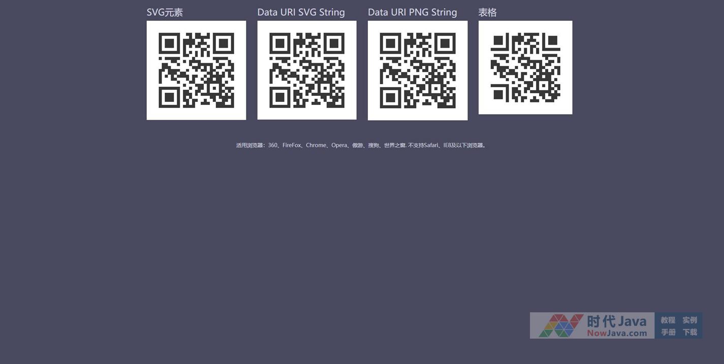js生成二维码插件是一款可以生成4种不同元素二维码代码,不兼容IE6,7,8。
