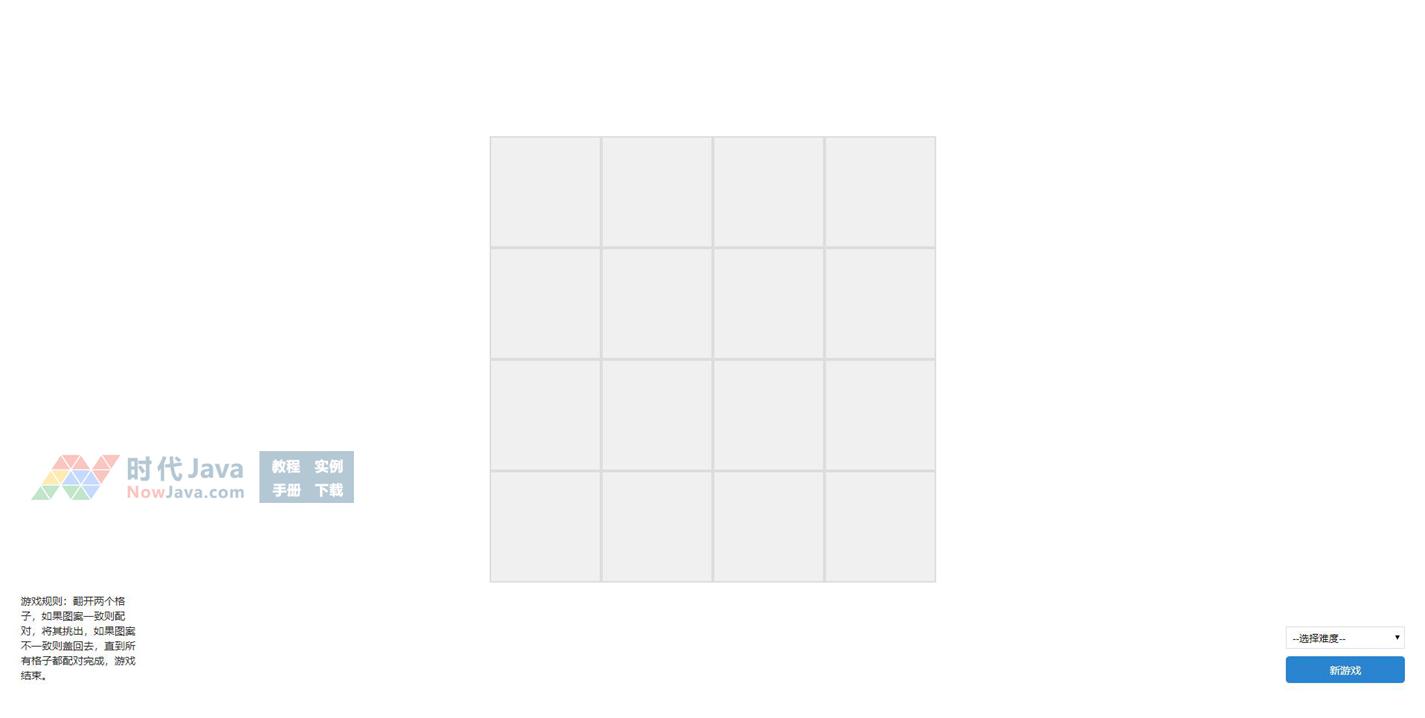 一款原生js开发的记忆翻牌匹配小游戏代码,有多种难度模式可以选择。游戏规则:翻开两个格子,如果图案一致则配对,将其挑出,如果图案不一致则盖回去,直到所有格子都配对完成,游戏结束。