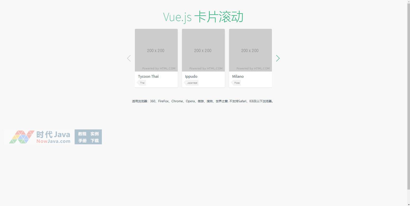 vue.js制作一款简单的单排图文卡片滚动切换代码,图片文字卡片布局,点击左右箭头控制卡片向左向左滚动切换。
