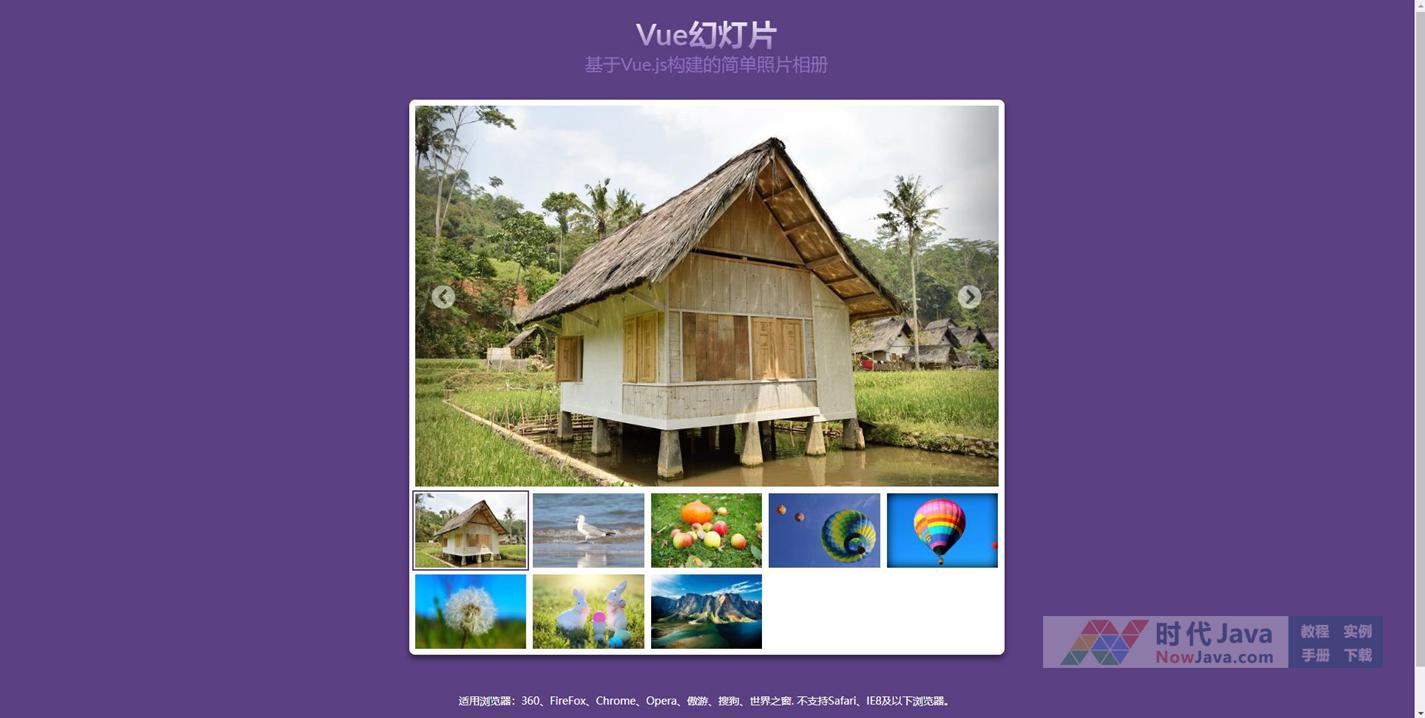 基于vue.js构建的简单图片相册幻灯片轮播切换代码,响应式幻灯片大图切换展示效果,点击小图或者箭头按钮控制切换。