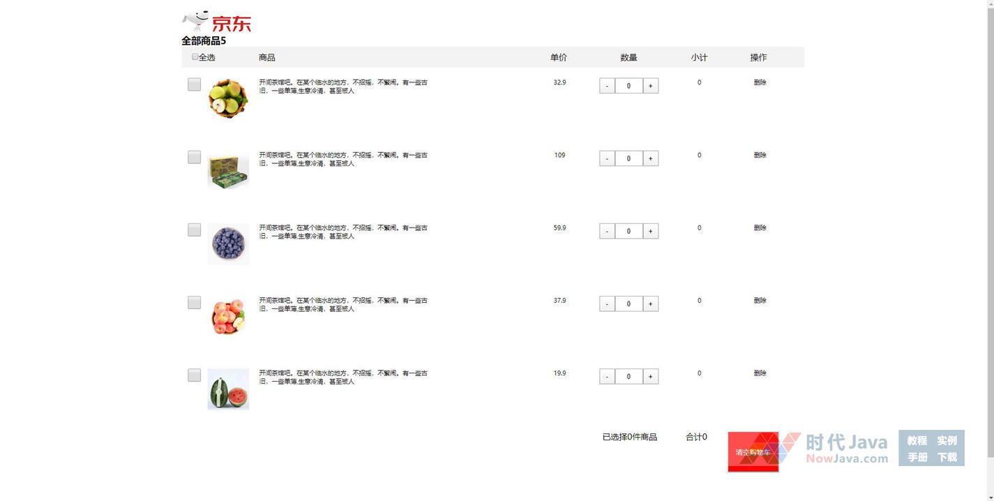 Vue.js购物车商品结算表单页面代码,支持单选多选全选、商品数量加减、删除商品和清空购物车等功能。