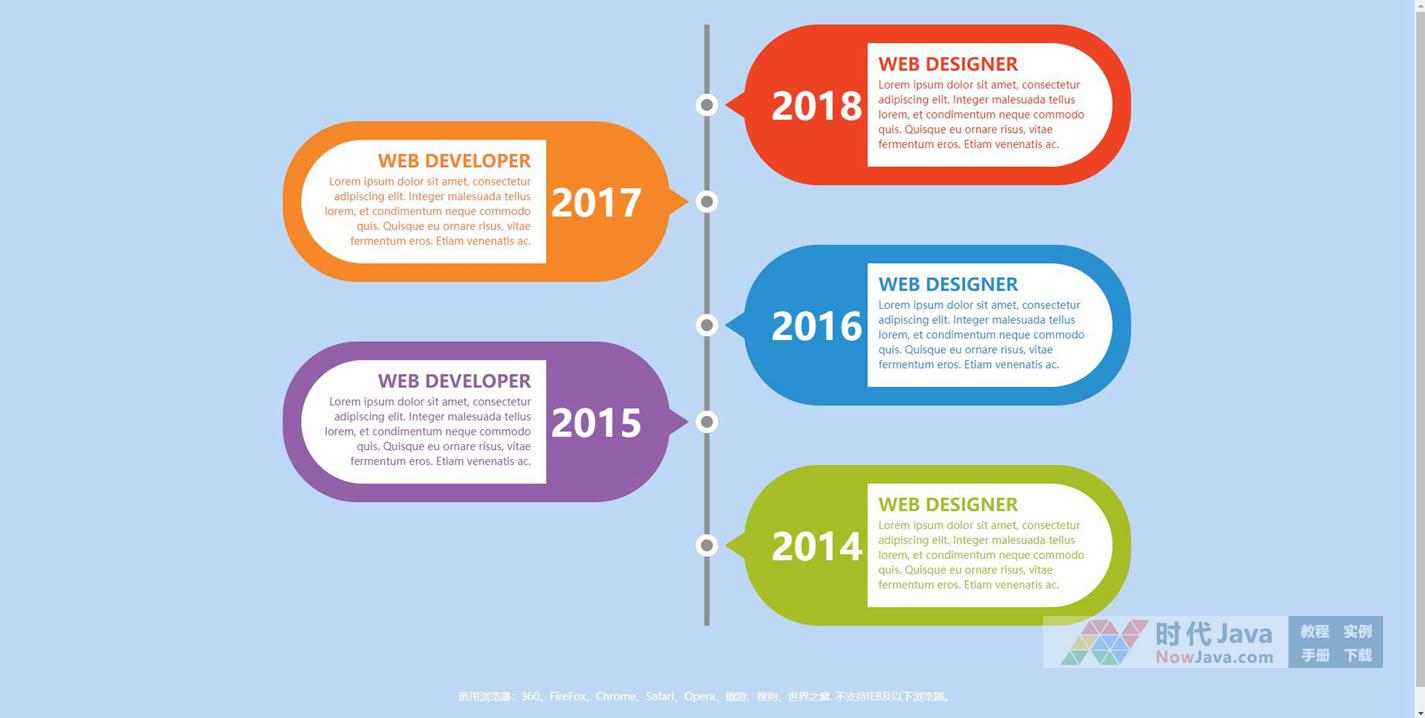 一款多彩风格的创意响应式CSS3垂直时间轴样式布局代码,纯CSS3制作的纵向时间轴样式,电脑手机端可通用。