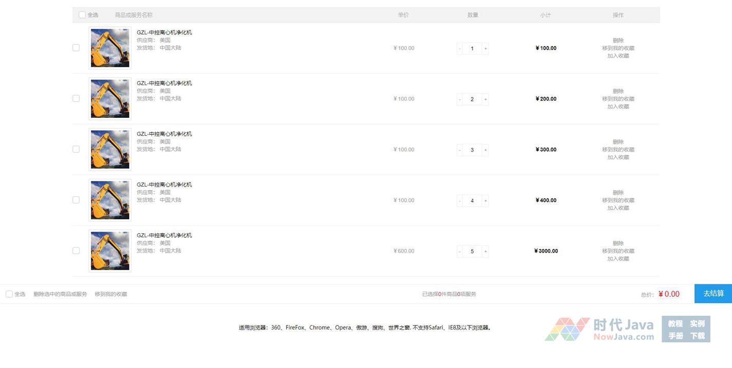 一款功能非常全面的vue购物车商品结算表单代码,vue.js购物车商品价格累加结算页面代码。支持商品全选,商品累加统计,支持收藏等功能。