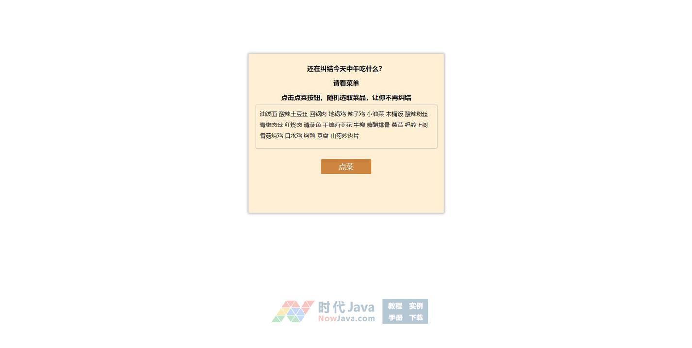 一款十分简单的原生js实现的随机点菜代码,点击点菜按钮随机点取上面菜单的菜品,可根据需求改成自己需要功能,比如说随机点名。