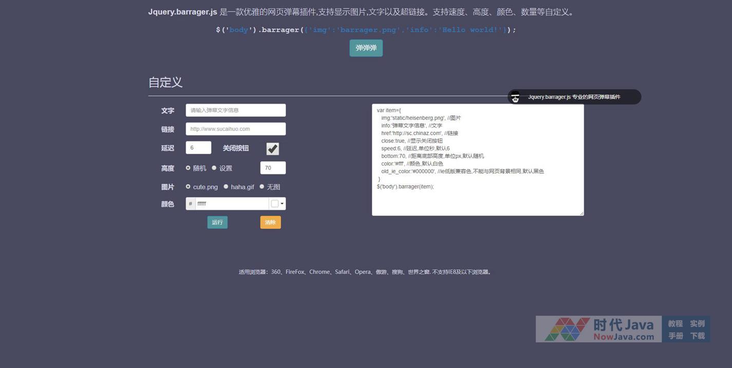 Jquery.barrager.js是一款优雅的网页弹幕插件,支持显示图片,文字以及超链接。支持速度、高度、颜色、数量等自定义。