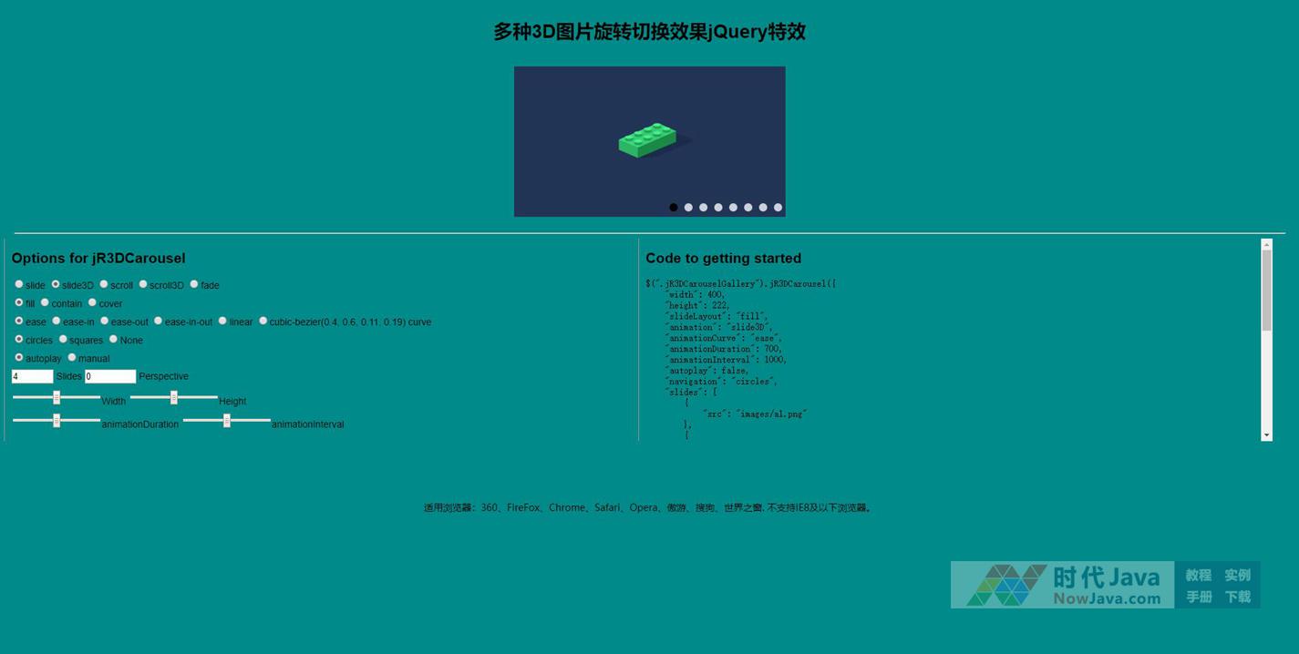 jR3DCarousel插件是一款响应式jQuery 3D图片旋转切换特效,效果类似3D旋转木马,有多种3D图片切换效果可供选择,你可以在演示调到自己喜欢的效果。
