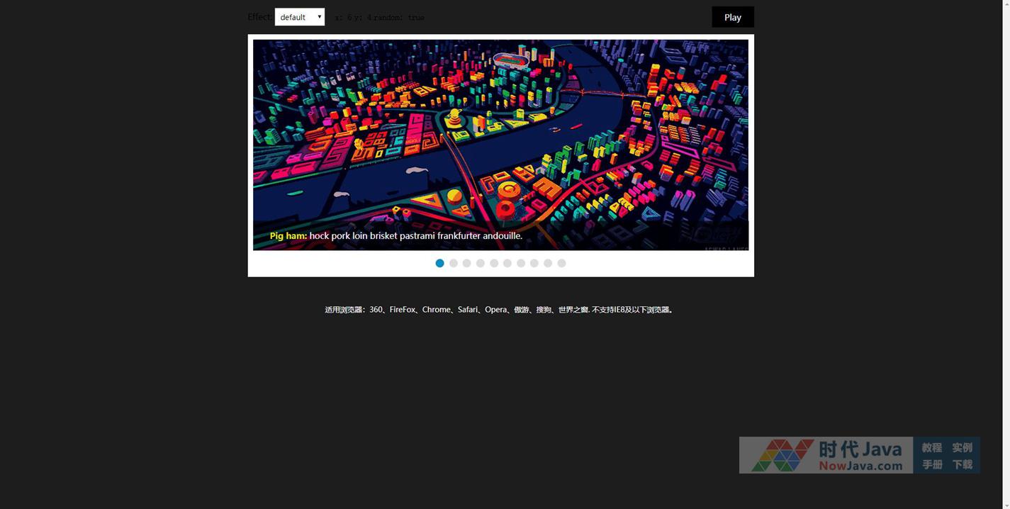 一款支持多达12种特效,22个自定义参数的多种切换效果jQuery焦点图片轮播插件,网页幻灯片自动切换特效。