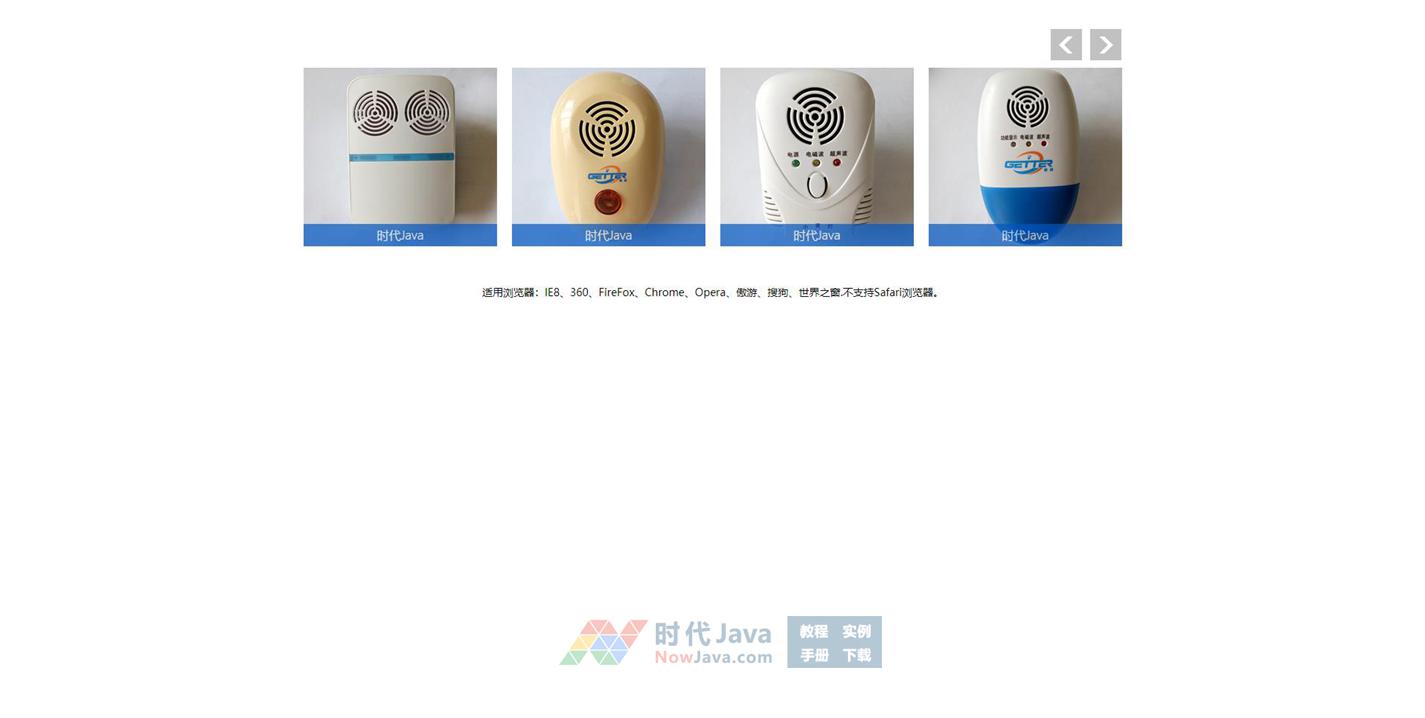这是一款鼠标悬停标题动画向上浮动出现蓝色背景遮罩,并带有加号点击查看详情的jQuery图片滚动代码效果,还可以点击箭头按钮控制图片向左向右滚动。