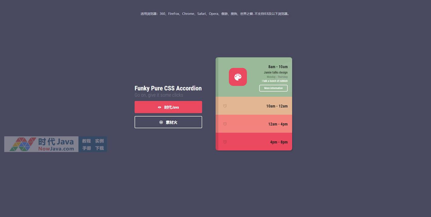 这是一款设计时尚漂亮,颜色搭配非常好的CSS3手风琴动画特效,带动画效果的手风琴切换代码。