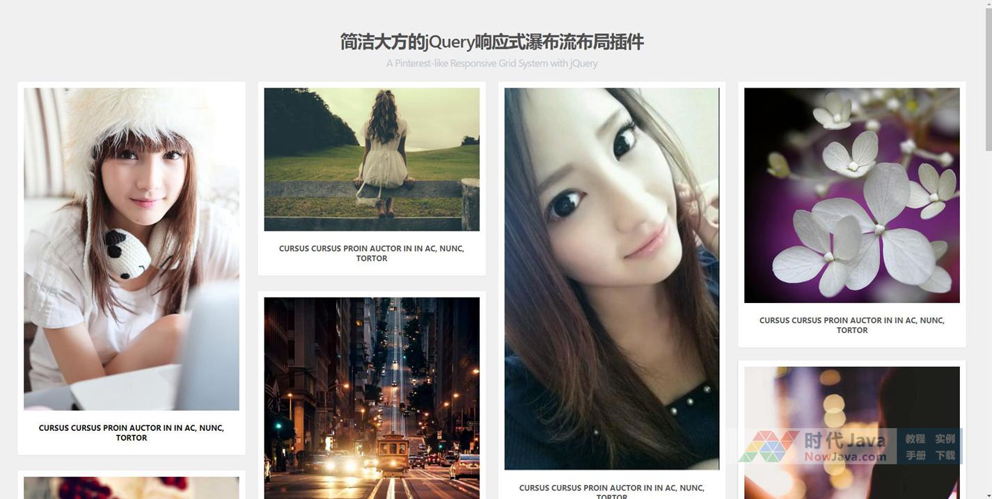 这是一款仿Pinterest网站的简洁大方又实用的全屏响应式网格瀑布流布局jQuery插件。该瀑布流插件通过简单的CSS和js代码制作出流式布局的网格系统,并通过媒体查询来控制网格的响应式效果。鼠标上去图片显示边框阴影,而且还有向上滑动动画效果。