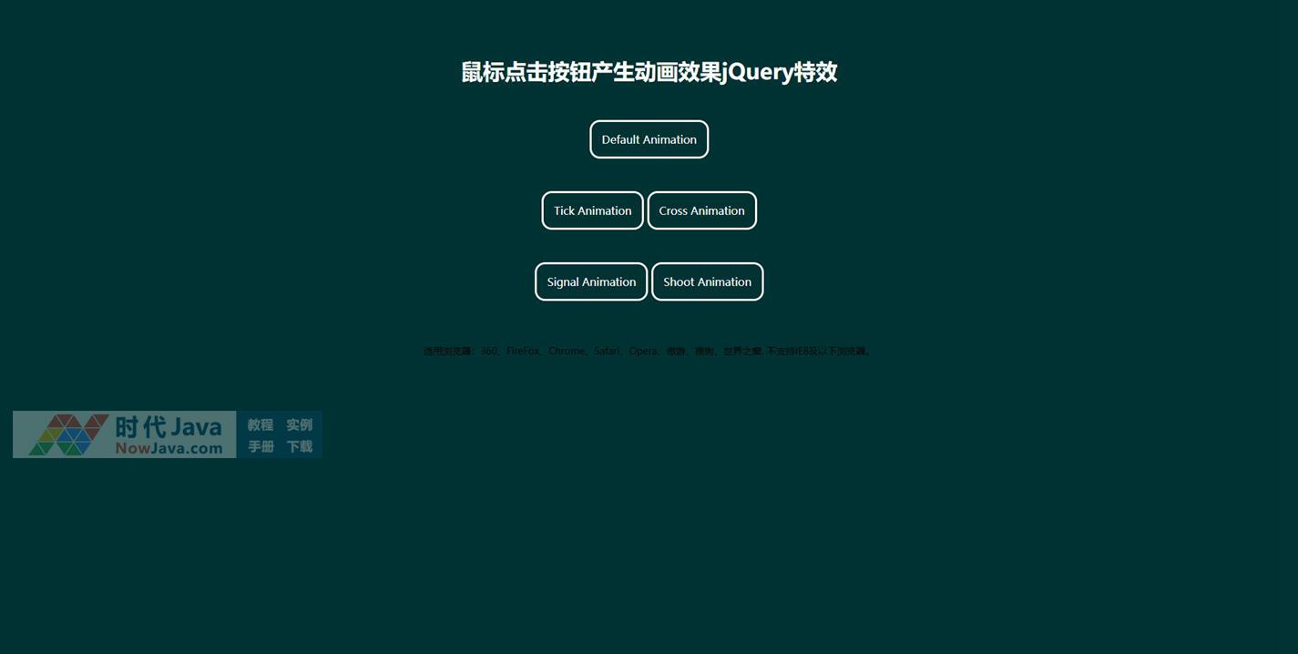 鼠标点击按钮产生动画效果jQuery特效是一款基于animateClick插件实现的自带5种动画来增强你的按钮单击或点击网页中的任何元素,该插件可以定义的颜色和大小的动画,例子中的按钮比较丑,请自行美化使用。