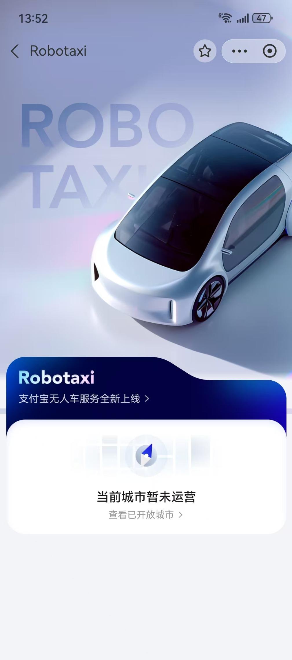 财联社记者获悉,支付宝Robotaxi打车小程序于近日全新上线。据官方客服,Robotaxi是支付宝出行频道提供的自动驾驶打车服务平台,目前聚合了小马智行等自动驾驶服务商,但尚未正式推出。Robotaxi小程序运营区域目前包括广州、东莞、北京、武汉、深圳五个城市的部分地区,更多城市正在陆续接入中。