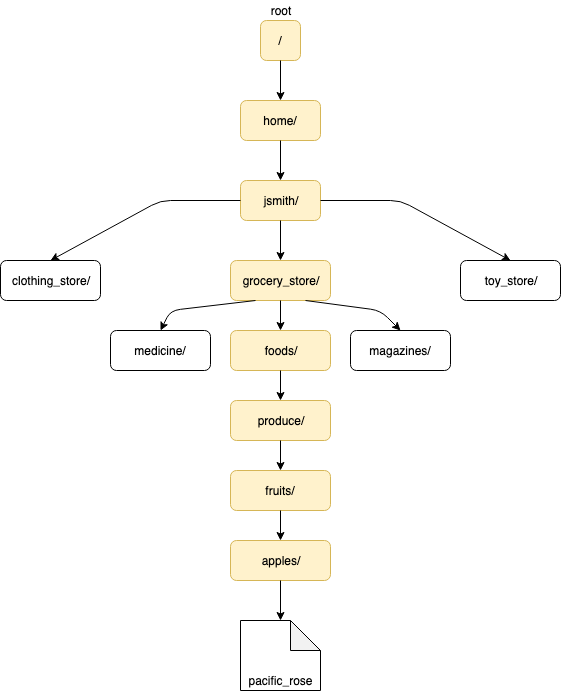 1 2 | $ pwd/home/jsmith/grocery_store/foods/produce/fruits |