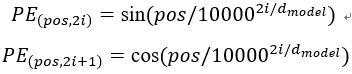 与 RNN 和 CNN 不同,在注意力机制中没有先后顺序的概念(如第一个元素,第二个元素等),输入序列的所有元素都以没有特殊顺序或位置的方式输入网络,模型不知道元素的先后顺序。因此,需要将与位置相关的信号添加到每个元素中,以帮助模型理解序列中元素的排列顺序。最简单直接的位置编码方式是将每个元素的序号加入元素编码后再输入模型,这样做是否可行呢?考虑到序列的长度可以是任意长度,只讨论元素的绝对位置是不全面的(同一个词,在由 3 个词组成的句子中的第三个位置和 30 个词组成的句子中的第三个位置所表达的意思很可能是不一样的)。因此 Transformer 使用了基于周期函数(sin/cos 函数)的位置编码方法。Transformer 的位置编码 PE 可以表示为