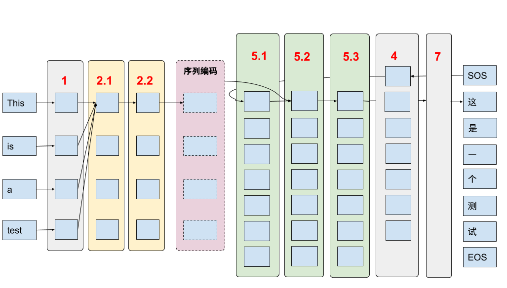 图 14 展示了 Transformer 在进行英-中翻译任务中的主要工作流程: