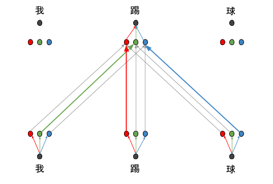 Transformer 仅仅使用注意力机制处理输入生成序列编码,由于注意力机制本质上只是对输入进行加权平均运算,没有引入新参数也没有使用非线性运算,这导致复杂特征提取能力不足,为了解决这个问题论文提出了多头注意力的方法。和卷积神经网络通过使用多个卷积核来发掘不同特征的思路类似,多头注意力也是通过多次随机初始化过程来提取不同特征。 图 12 中通过三次随机初始化分别得到了三种特征:红色表示动作,绿色表做动作施加者,蓝色表示动作承受着,可以看到在对"踢"进行了三次自注意力运算,分别对应三种特征。在对于动作信息的自注意力运算中,"我"和"球"的权值(灰色细线表示)比"踢"的权值(红色粗线)要小很多;同样,对动作施加者的自注意力运算中,"我"(绿色粗线)则是主要贡献者。在将三次自注意力运算的结果相加后,得到的新的"踢"的编码中就包含了三种特征的信息。理论上随机初始化测次数越多就越有可能发现有效的特征,不过随之增长的是训练参数的增加,这意味着训练难度的提高,因此需要平衡,在 Transformer 模型中这个值是 8。