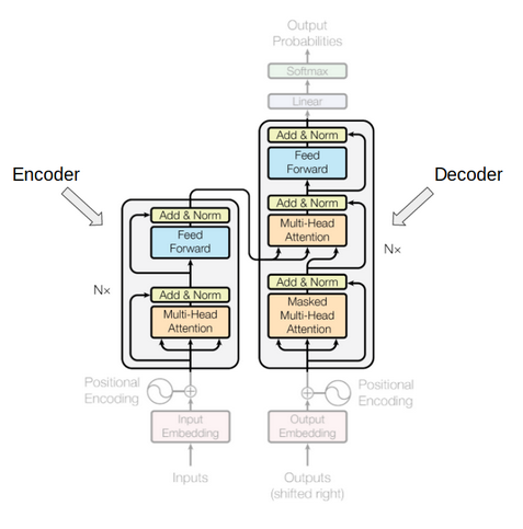 在介绍了 Transformer 的主要组成部分之后,我们再来完整看一下 Transformer 模型。整体上来看,Transformer 模型属于编码器-解码器架构,由于解码器需要根据序列编码和上一步的解码器输出来产生下一个输出,因此 Transformer 属于自回归模型(autoregressive model)。