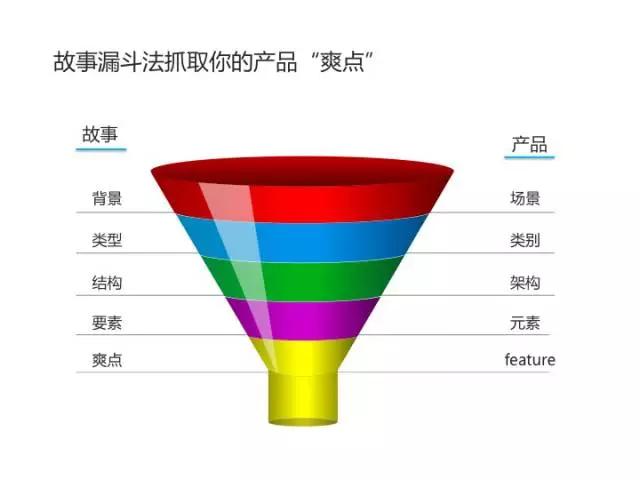 最小可行性产品提倡两个方面核心点:找到核心功能、找准种子用户。在产品设计的初期阶段,核心功能的选取就类似于故事主线的梳理。一个故事创作会经历“背景”、“类型”、“结构”、“要素”、“爽点”的层层漏斗式提炼,对应到产品设计过程中,也即“场景”、“类别”、“架构”、“元素”、“feature”。因此打磨产品的过程是一个讲故事的过程,我们可以借用讲故事的一些技巧到最小可行性产品的设计中去。