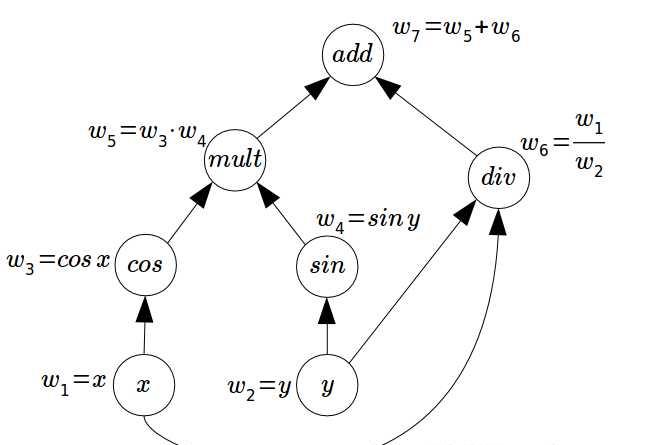 计算图是计算代数中的一个基础处理方法,在机器学习中的神经网络和其他模型推导算法和软件包方面非常富有成效。计算图中的基本思想是表达一些模型——例如前馈神经网络,计算图作为表示计算步骤序列的一个有向图。序列中的每个步骤对应于计算图中的顶点, 每个步骤对应一个简单的操作,每个操作接受一些输入并根据其输入产生一些输出。 在下面的图示中,我们有两个输入w1 = x和w2 = y,这个输入将流经图形,其中图形中的每个节点都是数学运算,为我们提供以下输出: