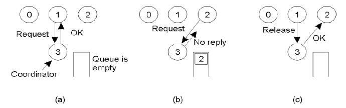 - (a) 进程1请求协调者允许它进入一个临界区。请求得到了批准;
