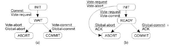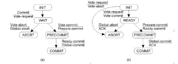 它们各自的状态机如图所示。(a 协调者,b 参与者)