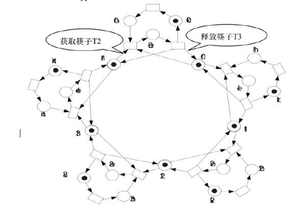 - 圆圈:hi,ki,ei,fi为库所 h:表示为哲学家饥饿状态库所 : k表示为哲学家思考状态的库所 e:表示为哲学家吃饭状态的库所 f:表示筷子处于备用状态的库所